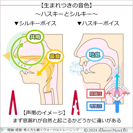 ハスキーボイスは声帯が完全に閉じないような形状に起因します。それ自体を変えることは不可能であり、さらにその隙間を埋めようとすれば、過剰閉鎖となり「ノド声」を招きます。