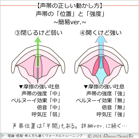 量「少」速度「遅」-位置「開→中」張度「弱」のバランスは、極力ボリュームを抑えたヒソヒソ話に当てはまります。呼気量も少なくて呼気速度も遅い、声門閉鎖圧も弱い発声は、一番少エネルギーな発声と言えます。張度は「弱」ですが、息だけでなく声が出ているので位置は「開→中」程度になります。