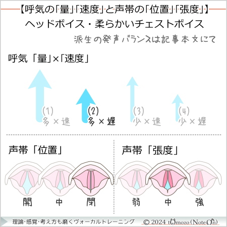 量「中→多」速度「遅」-位置「閉」張度「中」のバランスは「ヘッドボイス」が当てはまります。このゆっくりな呼気のスピードを特に活用するのがヘッドボイスの発声です。ウィスパーボイスやファルセットは呼気の流れを前方のベクトルに積極的に流しますが、ヘッドボイスは共鳴の響きを溜めるために後方にベクトルを取り、共鳴腔内/声道内にじわっと循環させる感覚が必要になります。