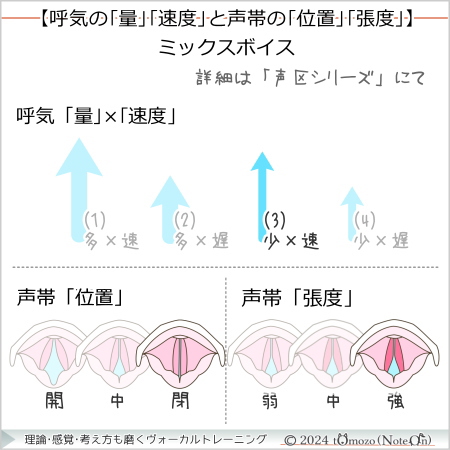 「多←中→少」「遅→中→速」-「閉→中」「強→中」=ミックスボイス