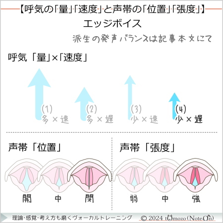 量「少」速度「遅」-位置「閉」張度「強」のバランスは、呼気量も少なくて呼気速度も遅いが、声門閉鎖圧が強めなケースの発声は、「エッジボイス」に代表されます。自転車のチェーンがオイル不足で「カラカラ」と鳴っているような状況に良く似ています。この場合のオイルは呼気ということです。呼気を流せば「スーっと」動きます。